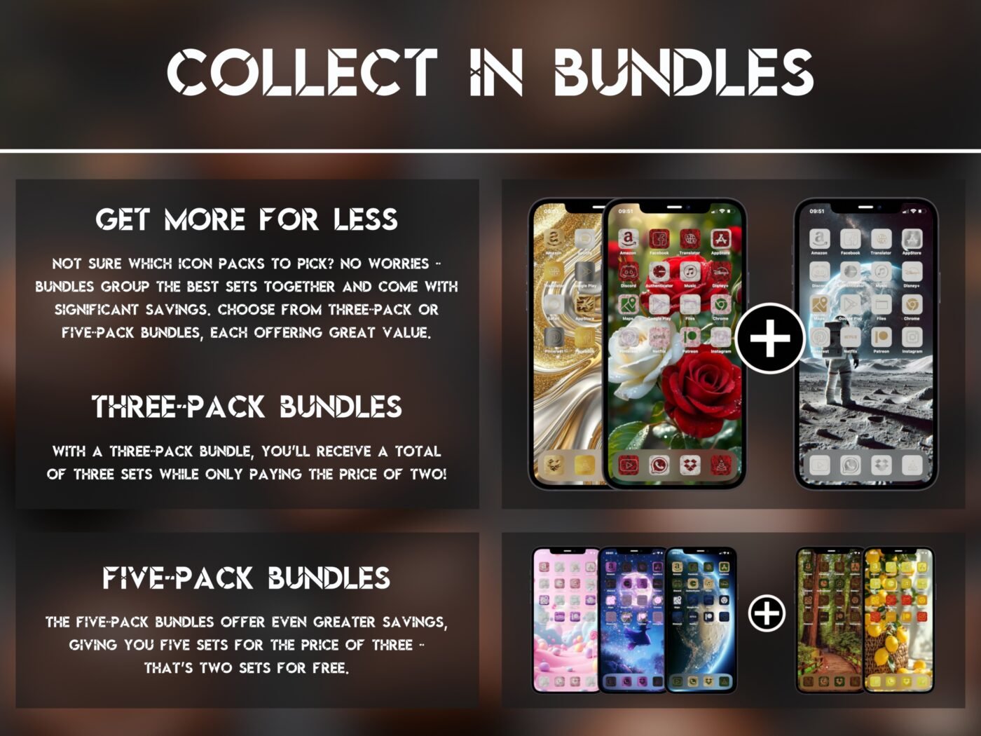 Not sure which icon packs to choose? Get more for less! Purchase bundles of either three or five packs. The three-pack gives you three for the price of two, and the five-pack gives you five for the price of three – that means two packs entirely for free! Check out the bundles page and get the best offers on the site!