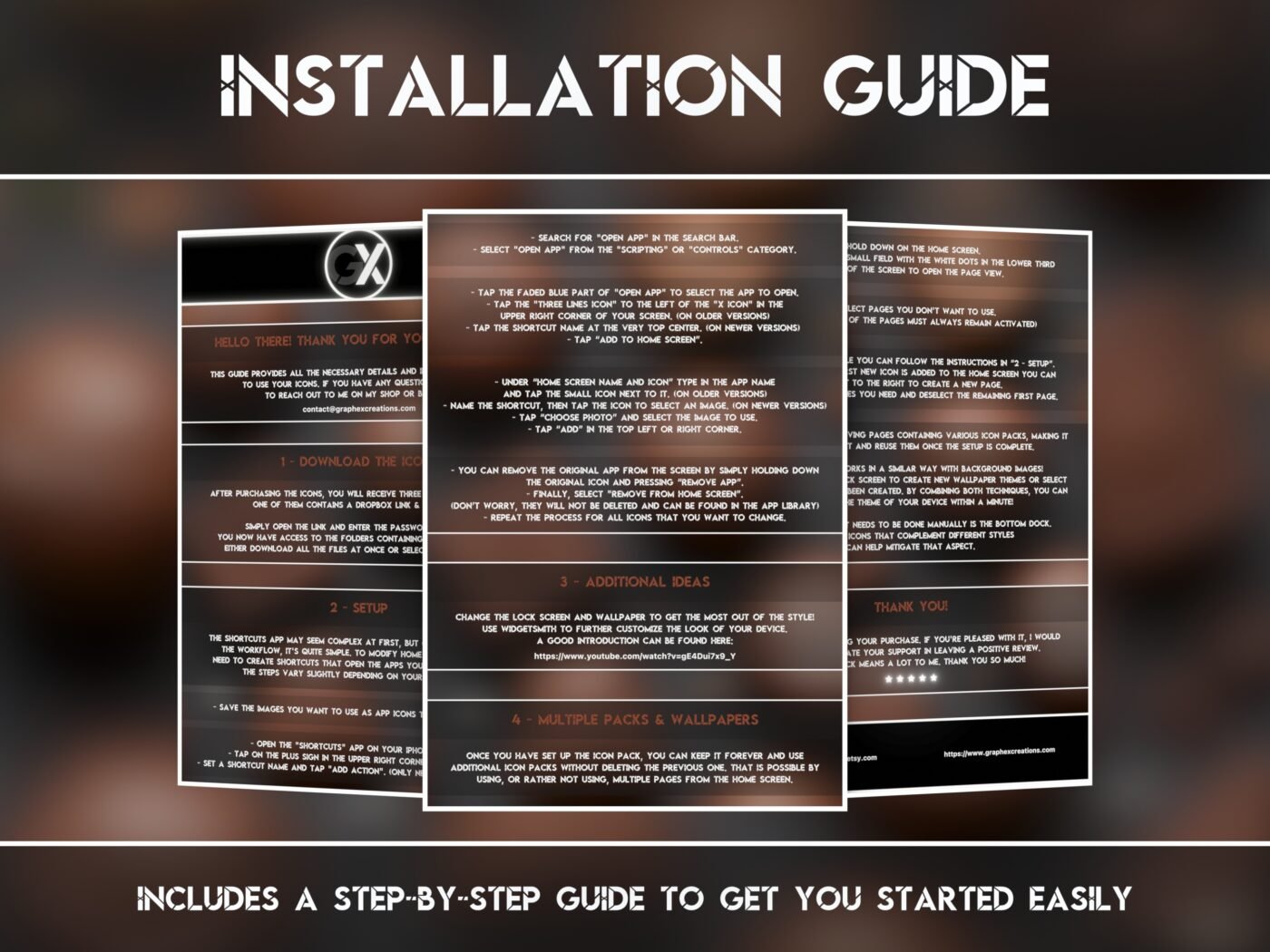 Instructions for changing the original icons are included. Without any prior experience in the setup process, it typically takes around 10 to 15 minutes for the first time. In addition, a link and password are provided in the scope of delivery. The icons can then be easily downloaded completely or by selection from Dropbox. All you need is the free and in most cases preinstalled app “shortcuts” from Apple. The product is therefore compatible with all iPhones and iPads.