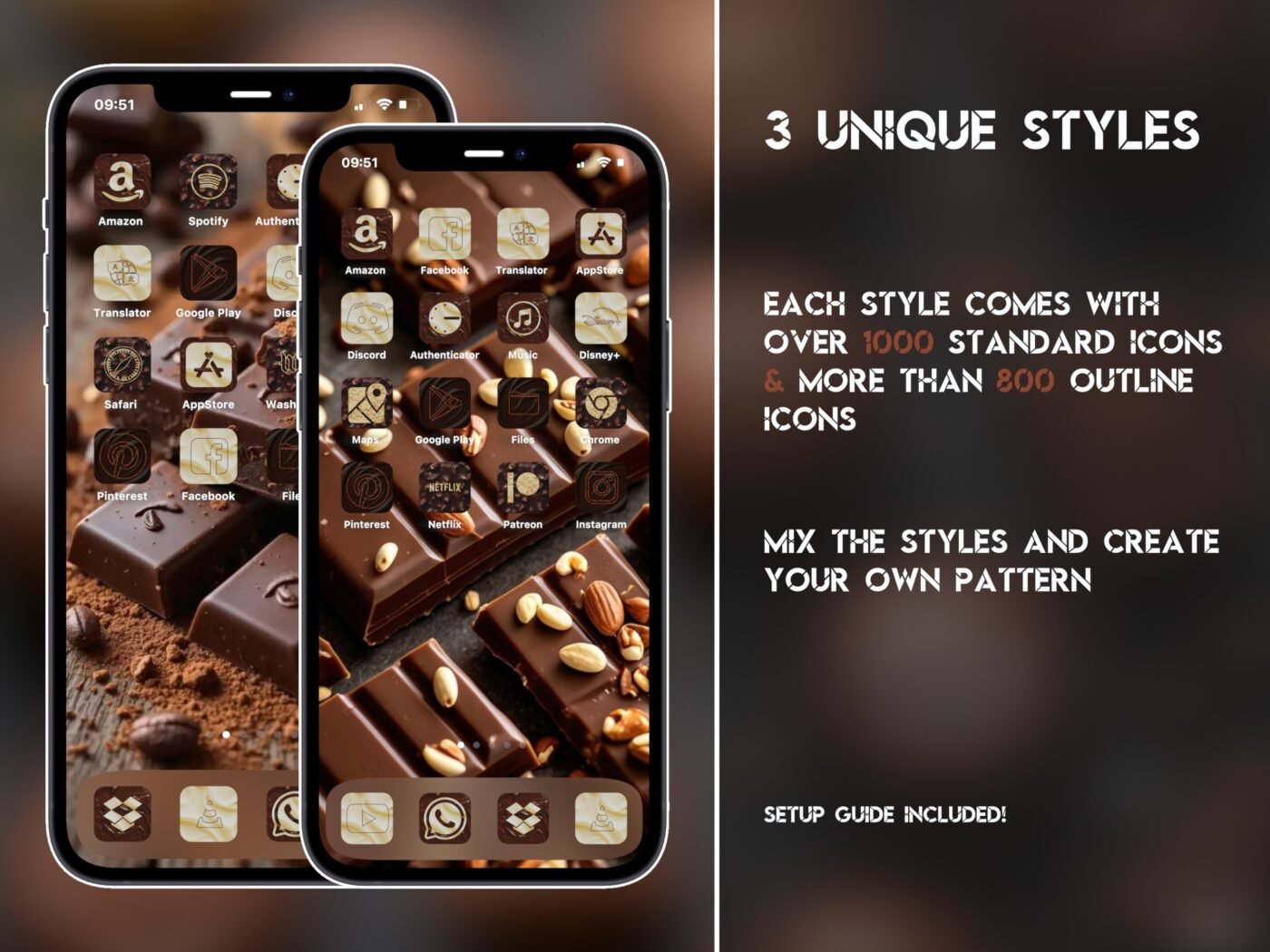 Hi there! This is an icon pack for iPhone and iPad themed around tasty Chocolate Dreams. Treat yourself to a rich, chocolate-inspired homescreen mix. It contains almost 6,000 icons in total across three unique styles!