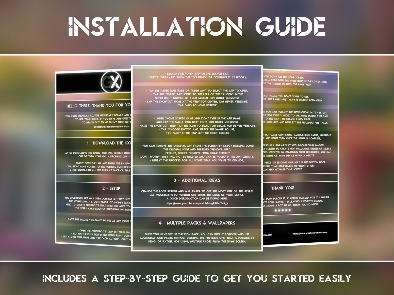 Instructions for changing the original icons are included. Without any prior experience in the setup process, it typically takes around 10 to 15 minutes for the first time. In addition, a link and password are provided for each pack in the scope of delivery. The icons can then be easily downloaded completely or by selection from Dropbox. All you need is the free and in most cases preinstalled app “shortcuts” from Apple. The product is therefore compatible with all iPhones and iPads.