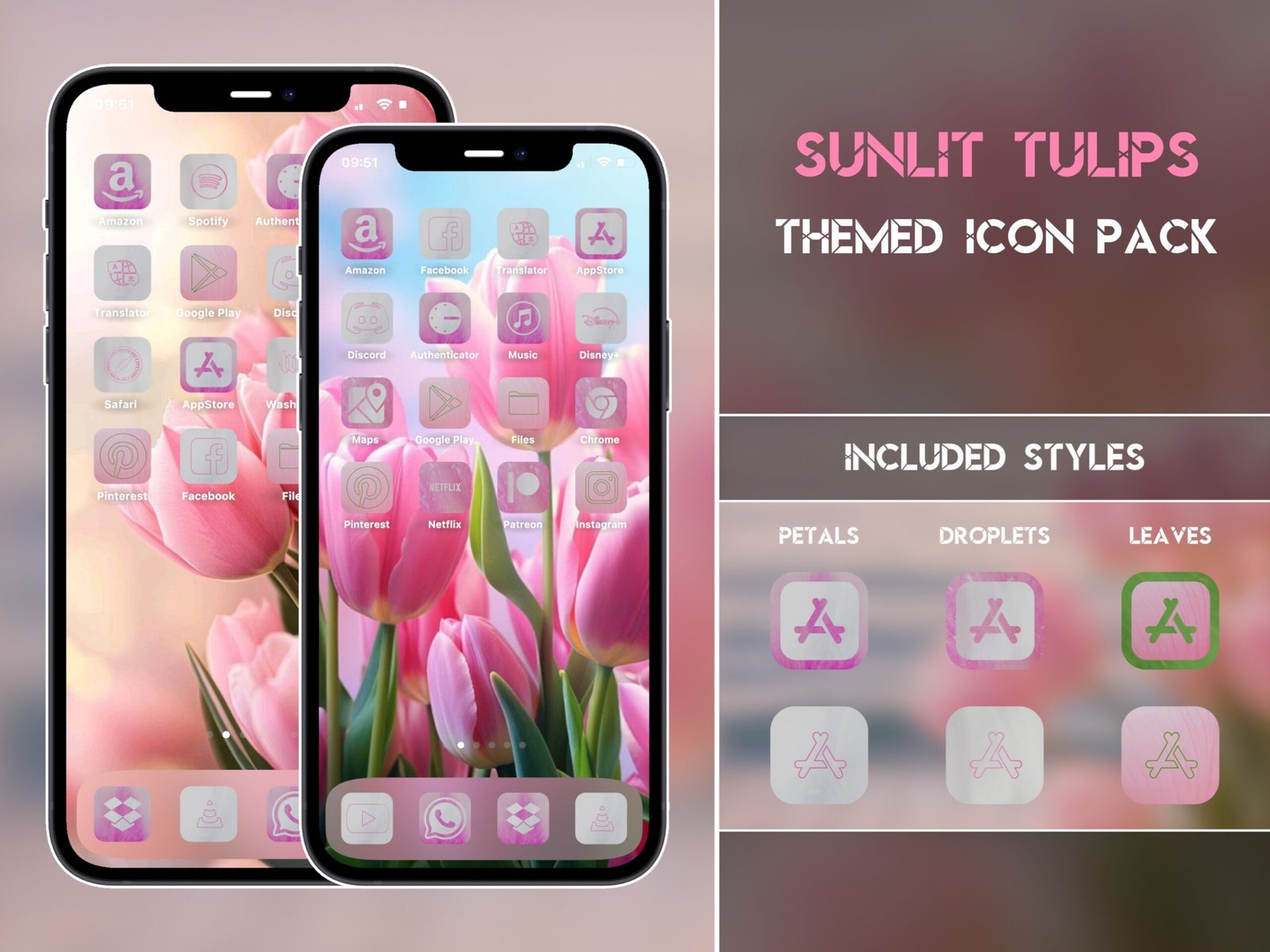 Hi there! This is an icon bundle for iPhone and iPad that includes three packs: The Sunlit Tulips, The Blossom Roses and The Blooming Violets Themed Icon Pack. When you purchase this bundle, you get three icon packs for the price of two. Each pack contains almost 6,000 icons in total across three unique styles!
