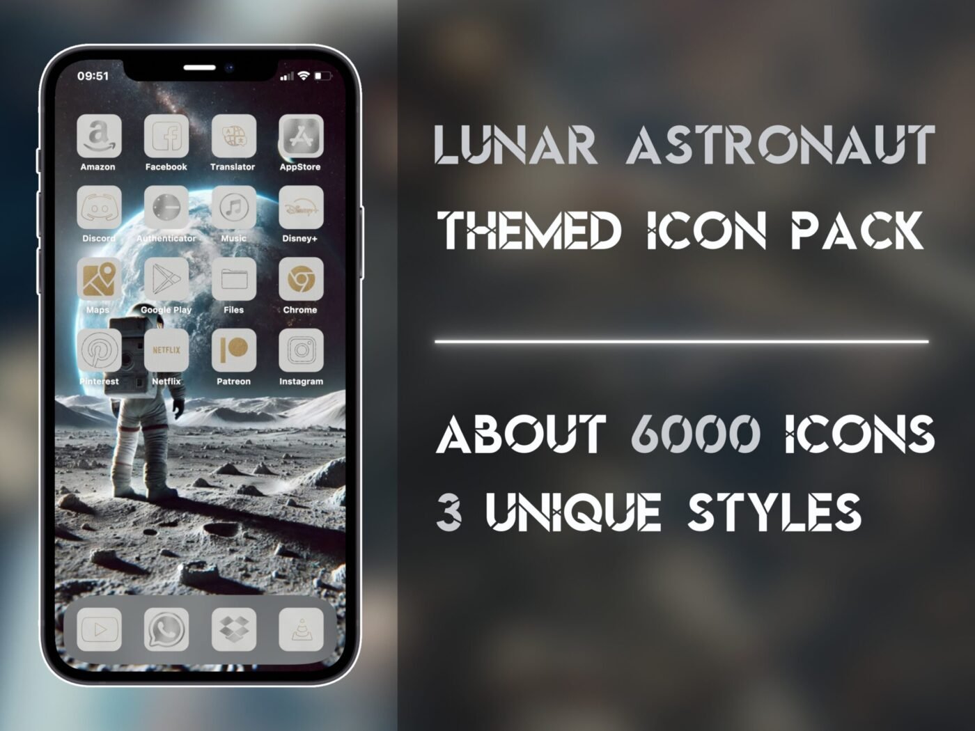 Hi there! This is an icon pack for iPhone and iPad themed around Lunar Astronauts. From Earth to orbit – your icons are going interstellar! It contains almost 6,000 icons in total across three unique styles!