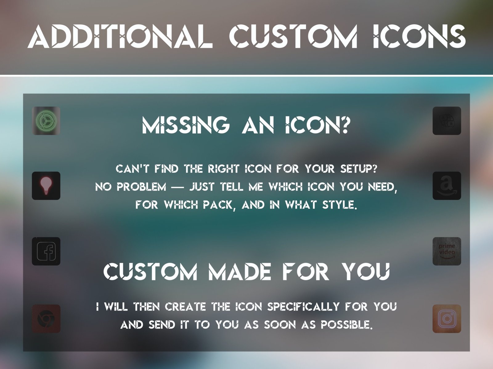 Please note that the wallpapers do not belong to me. However, in the package, you will find the required links to download them free of charge. When you purchase this pack, you’ll receive a set of high-quality, themed, handmade icons. Kindly be aware that they are for personal use only.