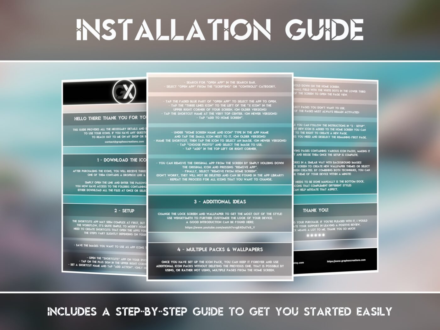 Instructions for changing the original icons are included. Without any prior experience in the setup process, it typically takes around 10 to 15 minutes for the first time. In addition, a link and password are provided for each pack in the scope of delivery. The icons can then be easily downloaded completely or by selection from Dropbox. All you need is the free and in most cases preinstalled app “shortcuts” from Apple. The product is therefore compatible with all iPhones and iPads.