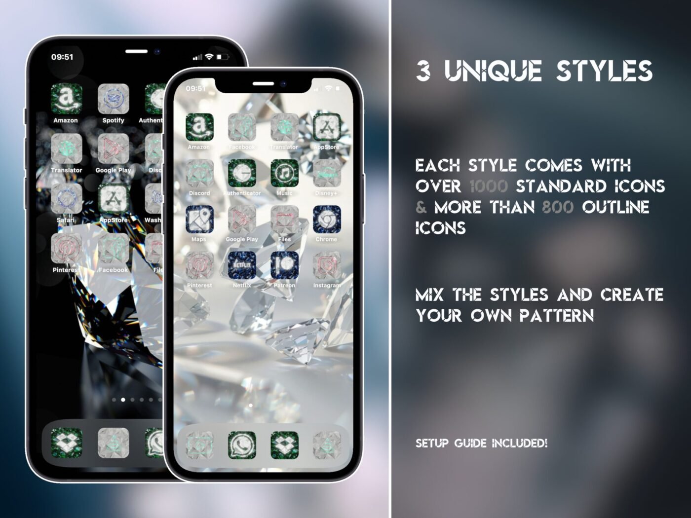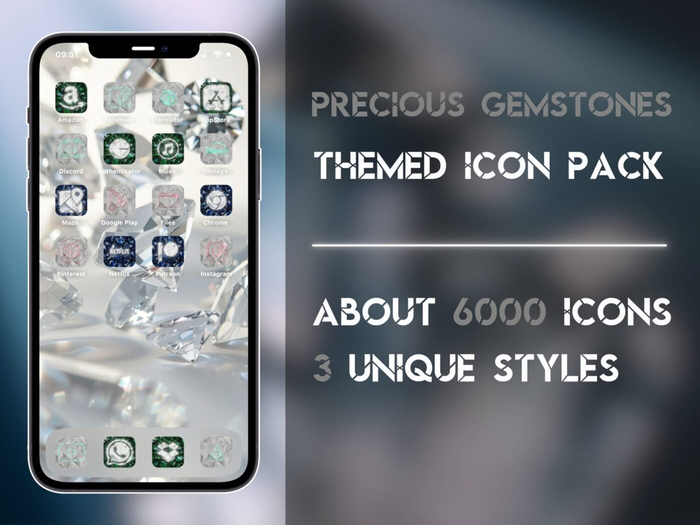 Hi there! This is an icon pack for iPhone and iPad themed around precious gemstones like diamonds. Let your icons shine with the brilliance of emerald, ruby, and sapphire! It contains almost 6,000 icons in total across three unique styles!