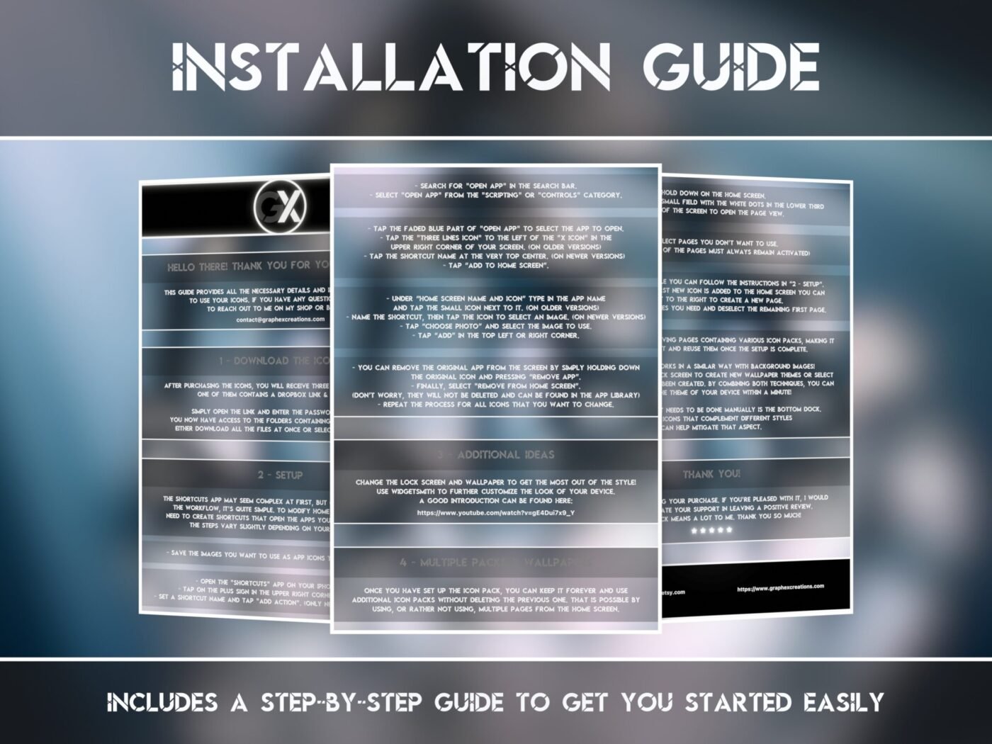 Instructions for changing the original icons are included. Without any prior experience in the setup process, it typically takes around 10 to 15 minutes for the first time. In addition, a link and password are provided in the scope of delivery. The icons can then be easily downloaded completely or by selection from Dropbox. All you need is the free and in most cases preinstalled app “shortcuts” from Apple. The product is therefore compatible with all iPhones and iPads.