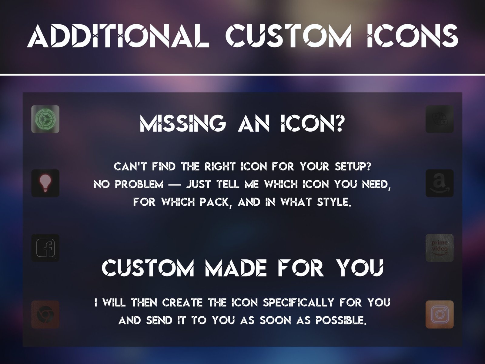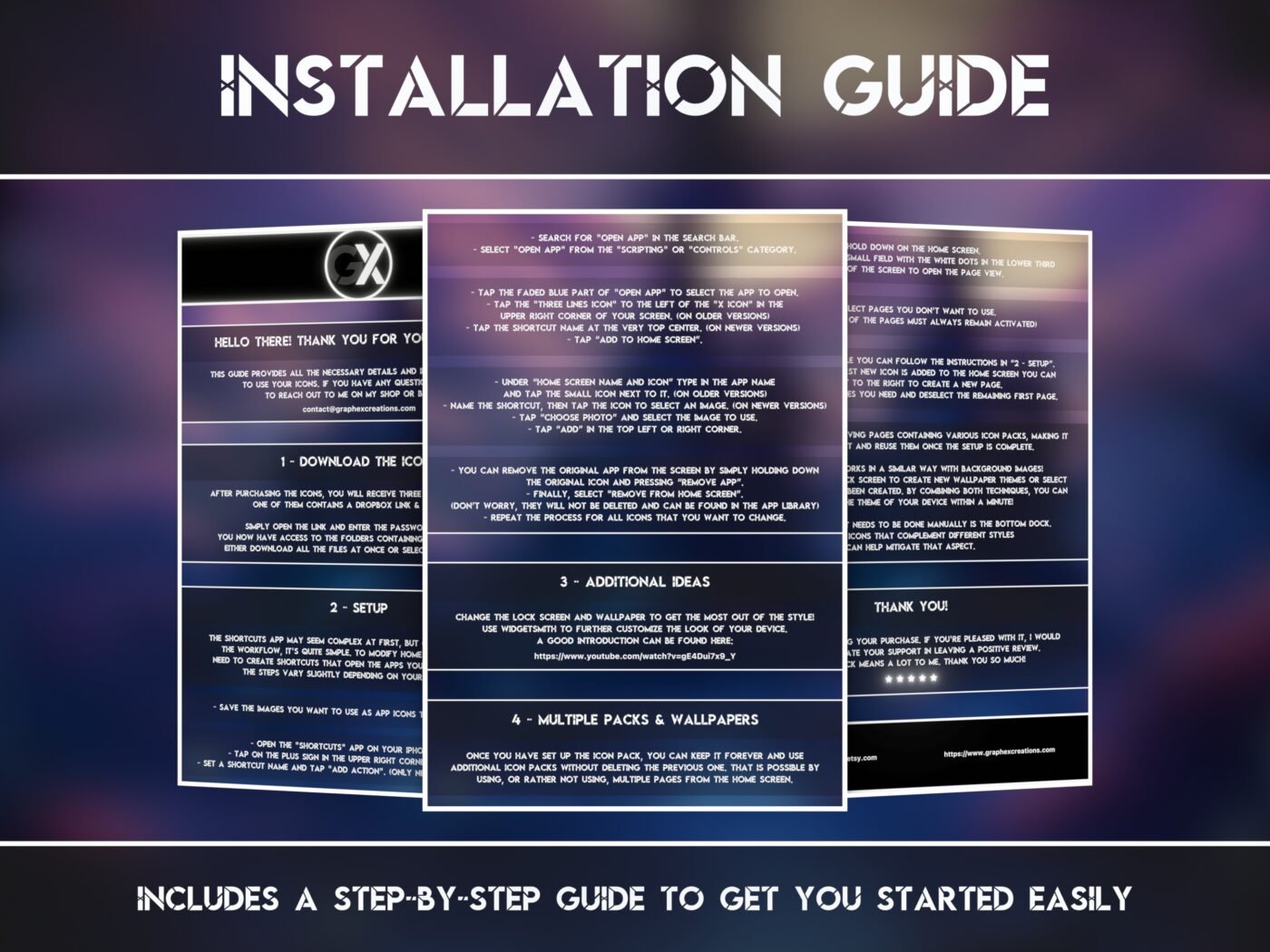 Instructions for changing the original icons are included. Without any prior experience in the setup process, it typically takes around 10 to 15 minutes for the first time. In addition, a link and password are provided for each pack in the scope of delivery. The icons can then be easily downloaded completely or by selection from Dropbox. All you need is the free and in most cases preinstalled app “shortcuts” from Apple. The product is therefore compatible with all iPhones and iPads.