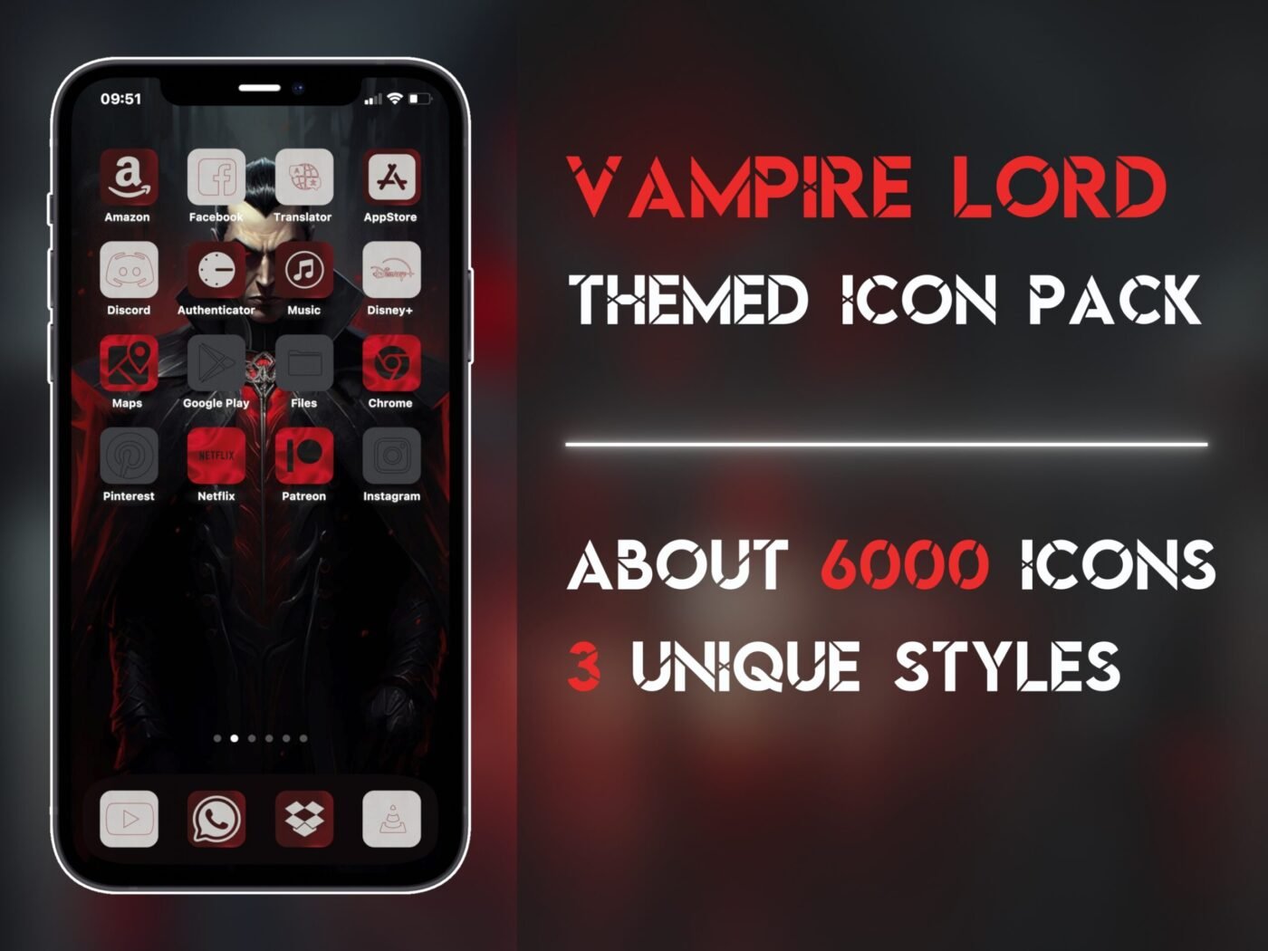Hi there! This is an icon pack for iPhone and iPad themed around Vampires like Dracula. Carry eternal elegance to your phone and satisfy the hunger of the icons. It contains almost 6,000 icons in total across three unique styles!
