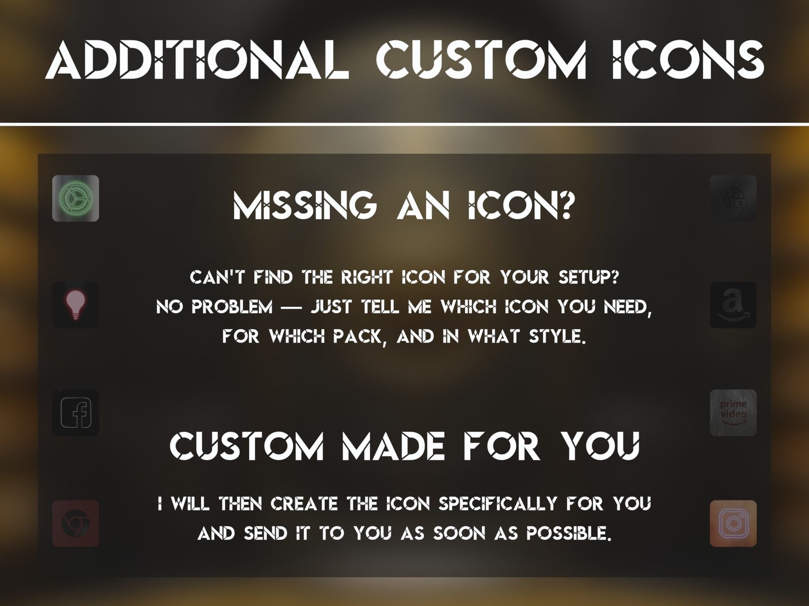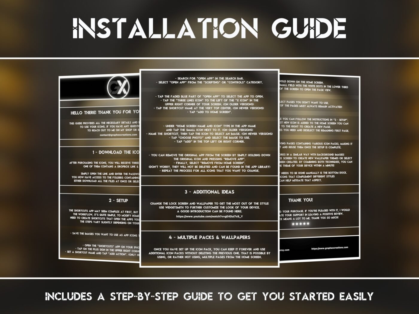 Instructions for changing the original icons are included. Without any prior experience in the setup process, it typically takes around 10 to 15 minutes for the first time. In addition, a link and password are provided for each pack in the scope of delivery. The icons can then be easily downloaded completely or by selection from Dropbox. All you need is the free and in most cases preinstalled app “shortcuts” from Apple. The product is therefore compatible with all iPhones and iPads.